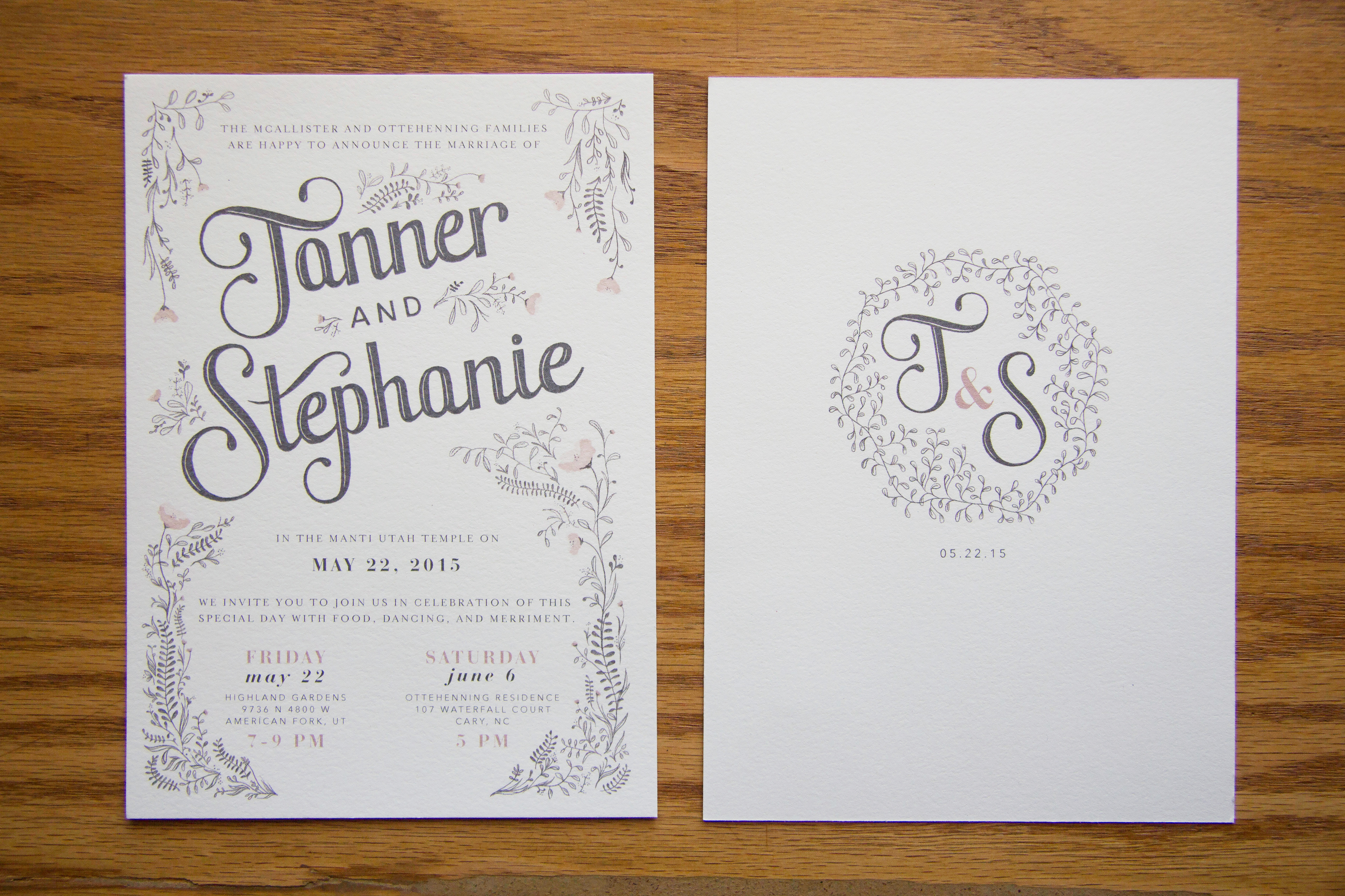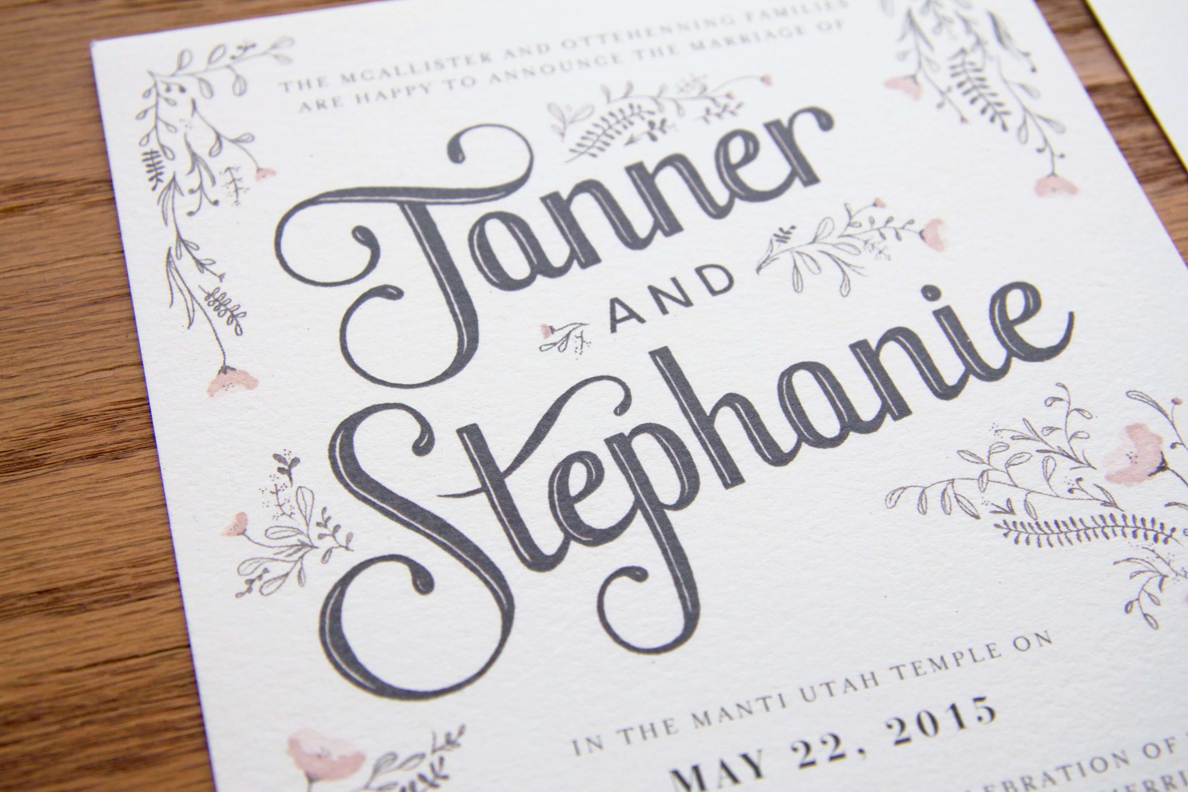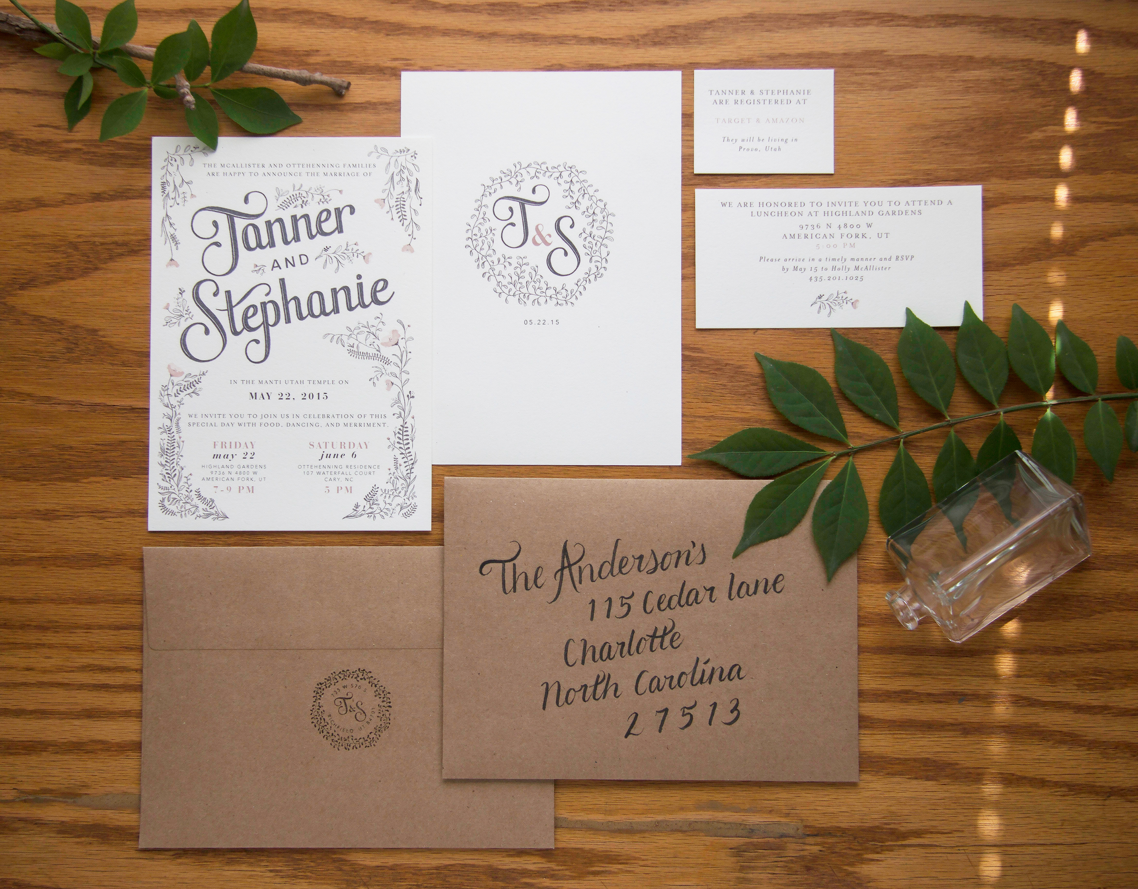 Personal wedding logo & stationary design with hand lettered names and floral illustration.